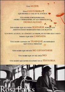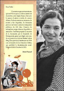 “Costurera negra norteamericana que en 1955 se negó a ceder su asiento en el autobús a otro viajero blanco. Este acto le supuso el arresto y multa de catorce dólares. Padeció numerosas amenazas de muerte y fue despedida. Su detención provocó un boicot contra los transportes públicos de 381 días. Cientos de trabajadores negros fueron despedidos y arrestados. También propició la creación de la Asociación por el Desarrollo de Montgomery, grupo que eligió como uno de sus portavoces al joven Martin Luther King. Estas protestas terminaron en 1964 con el Acuerdo de los Derechos Civiles, que prohibió la discriminación racial. Falleció el 25 de Octubre de 2005”.
