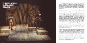 El ruido de los huesos que crujen, es una magnífica ocasión para conocer a Suzanne Lebeau y sumergirse en su mundo. Suzanne Lebeau siempre trabaja hasta el límite. En este texto va más allá y profundiza en un tema duro y complicado como solo ella puede hacerlo. Una vez más, se enfrenta a su propio desafío, se enfrenta a la necesidad que ella tiene de hablar a los jóvenes de cosas trascendentes, de otros mundos, de otras realidades diferentes que están más cerca que nunca en este mundo globalizado en el que vivimos. Lo vemos en la televisión, en los periódicos, se habla de ello en conversaciones y chicas y chicos también lo ven y lo oyen. Esto no se puede obviar; es más, nos parece imprescindible hablar de ello a jóvenes que tienen derecho y necesidad de ser conscientes de que existen realidades diferentes a la suya. No se les puede aislar en una falsa burbuja, sería una traición que Suzanne Lebeau jamás cometerá. Nosotros tampoco.